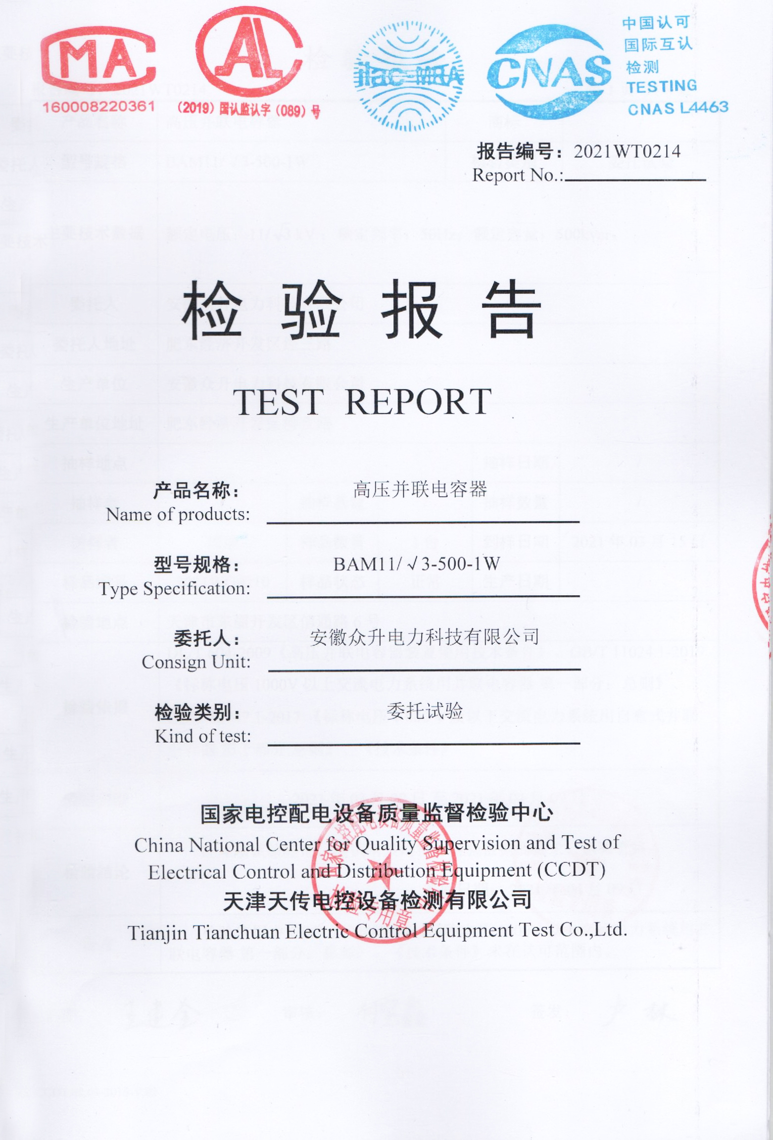 自愈式低壓并聯(lián)電容器檢驗(yàn)報(bào)告