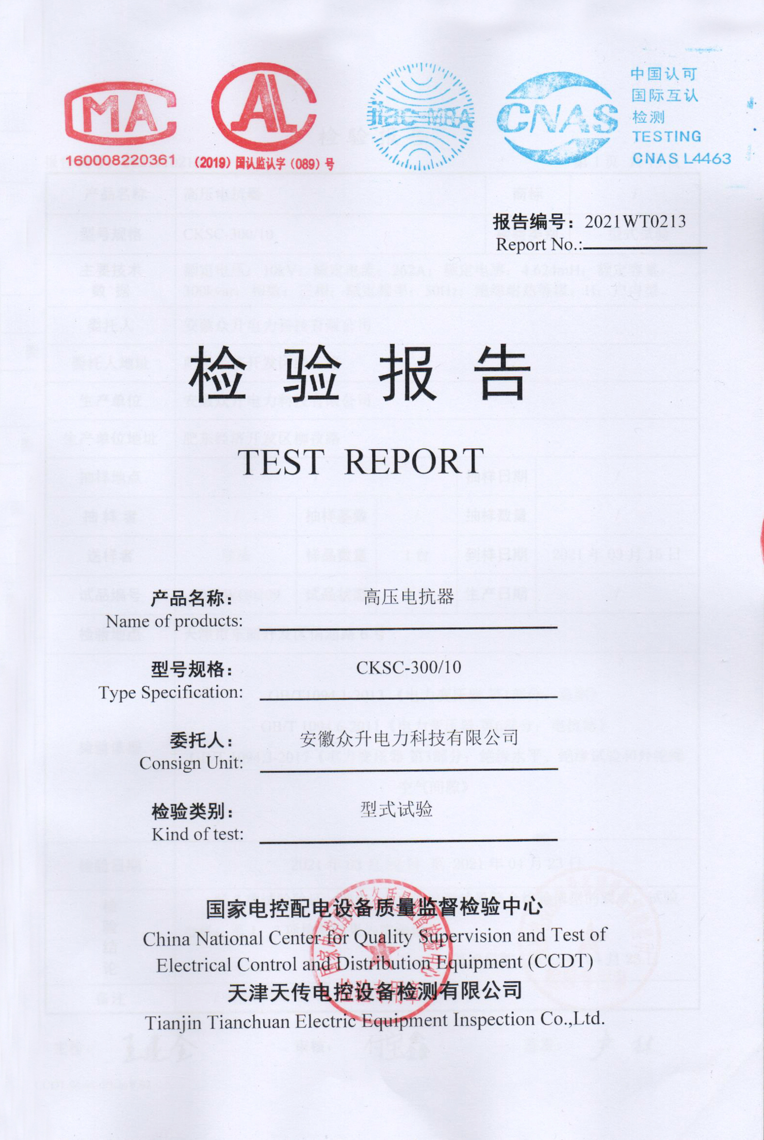 高壓電抗器檢驗(yàn)報(bào)告